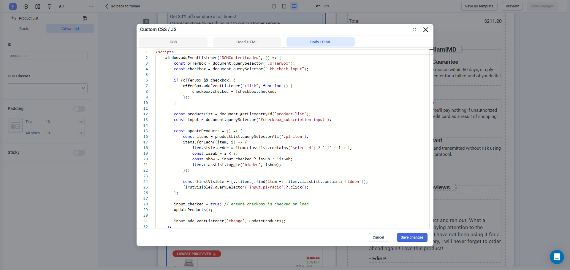 Now when users click the offer box or checkbox, the product list will update in real-time, showing either subscriptions or one-time purchase options.