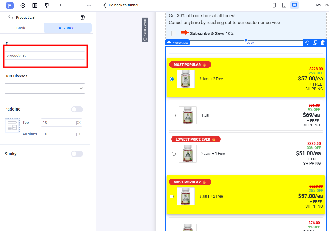 Next, add the Product List element to your funnel. This is where your products will appear and dynamically show/hide based on the checkbox.