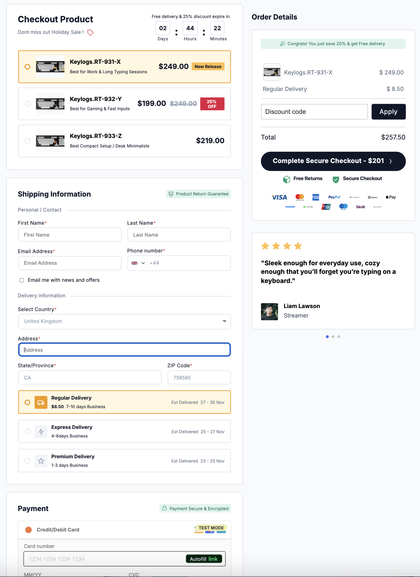 It reiterates the current discount, offers multiple delivery speed options, and includes trust badges (Secure Checkout, Free Returns) right next to the “Complete Checkout” button to make the buyer feel perfectly safe entering their payment details.