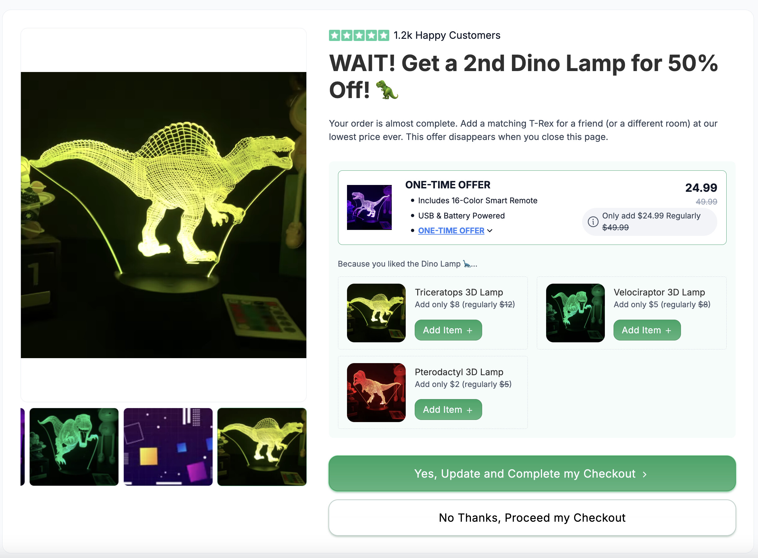 Zero decision fatigue: Instead of doing mental math on a crowded product page, the customer just reads a single headline and clicks the big green “Yes” button to add the 50% off lamp to their order.