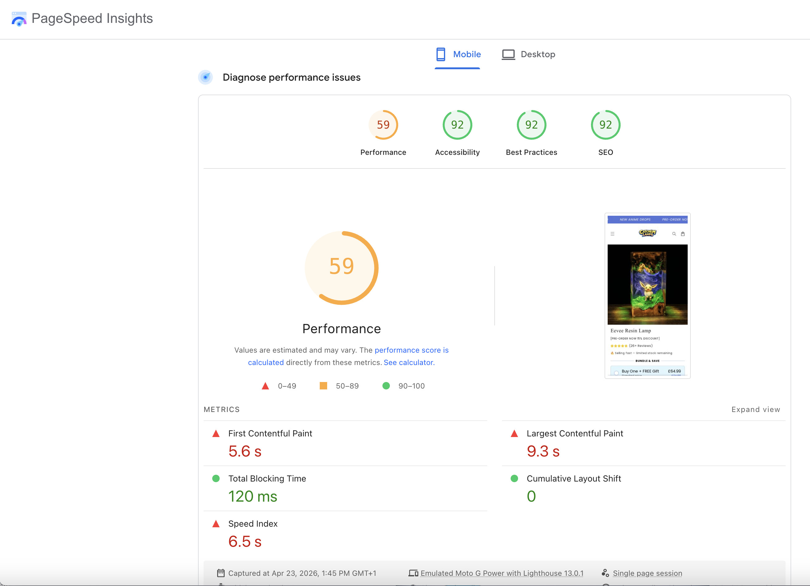 A 59 overall performance score is bad, but the real crime here is the Largest Contentful Paint (LCP) at 9.3 seconds and the First Contentful Paint at 5.6 seconds.