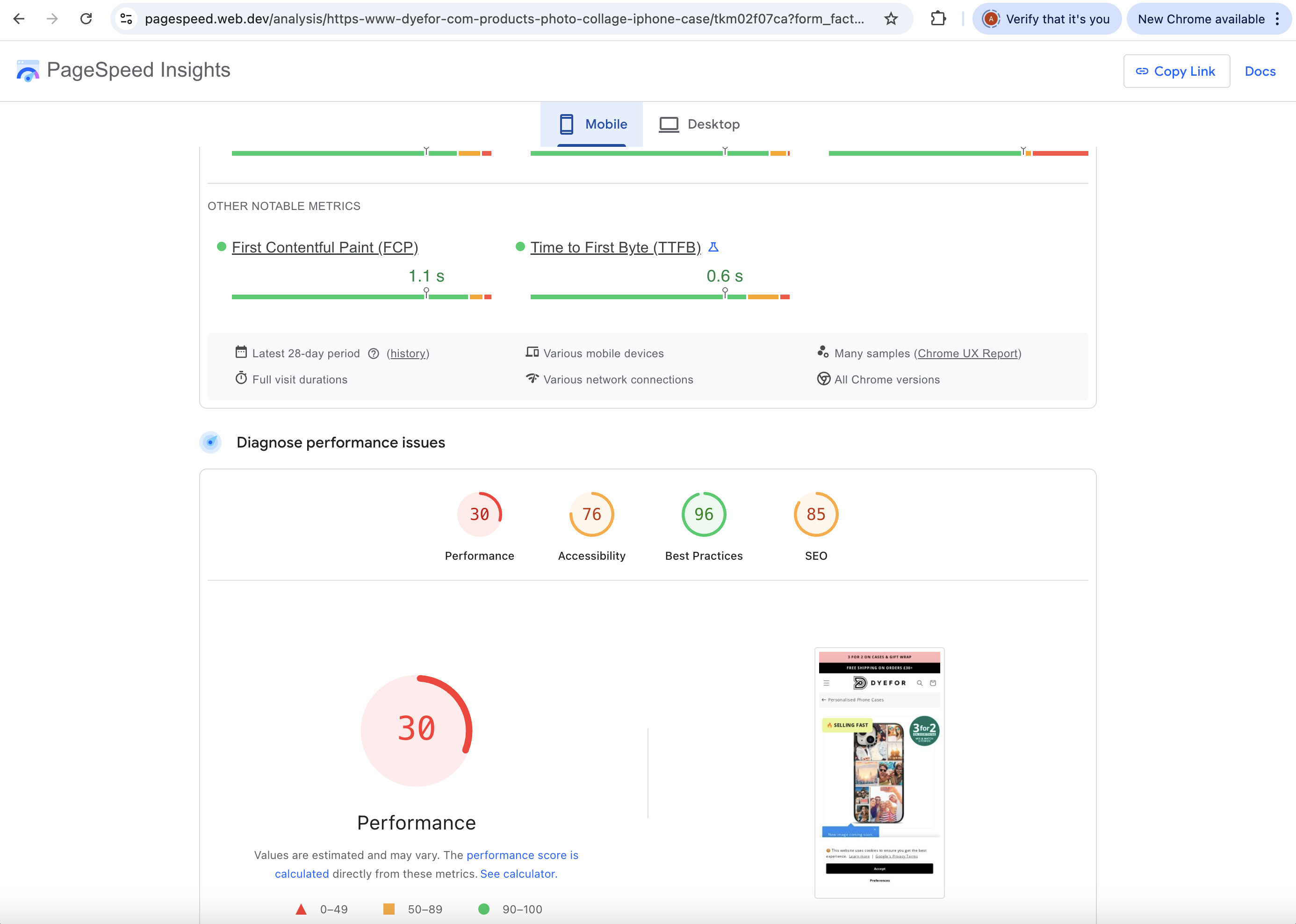 Despite having great branding and products, the mobile performance score is sitting at 30.