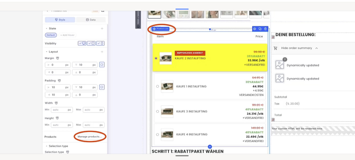 Go to your checkout page and click Product list element > Manage products