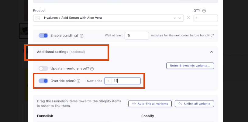 If you want the order to sync to Shopify with a different price, you can click Additional settings and enable override price, then set your desired price, if you want to sync the price as it is, you may keep it disabled.
