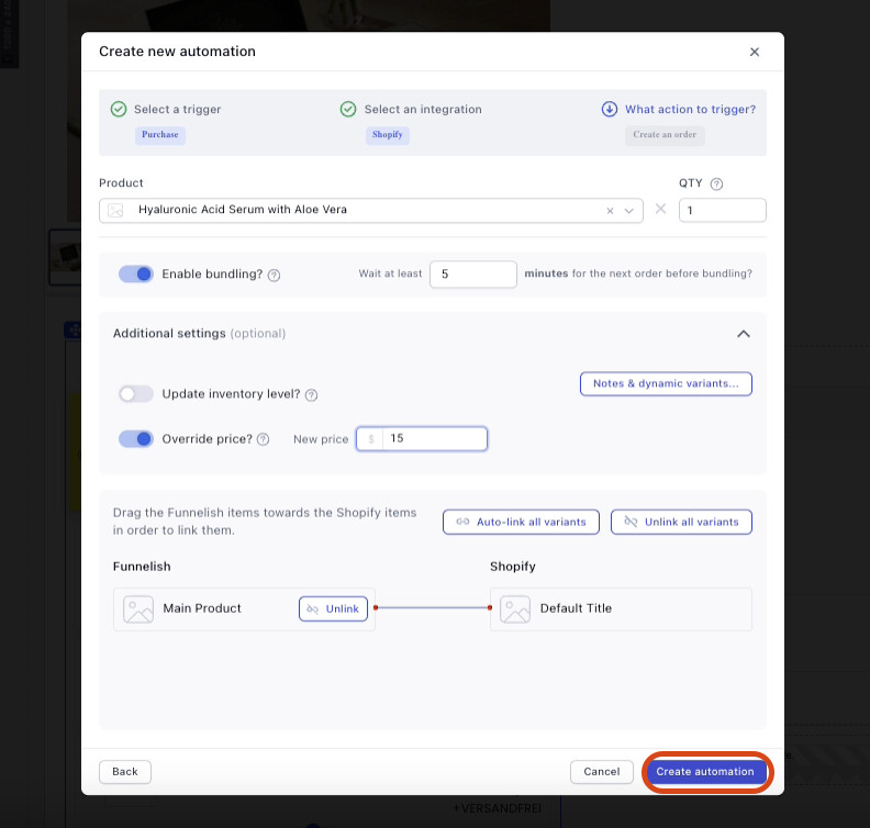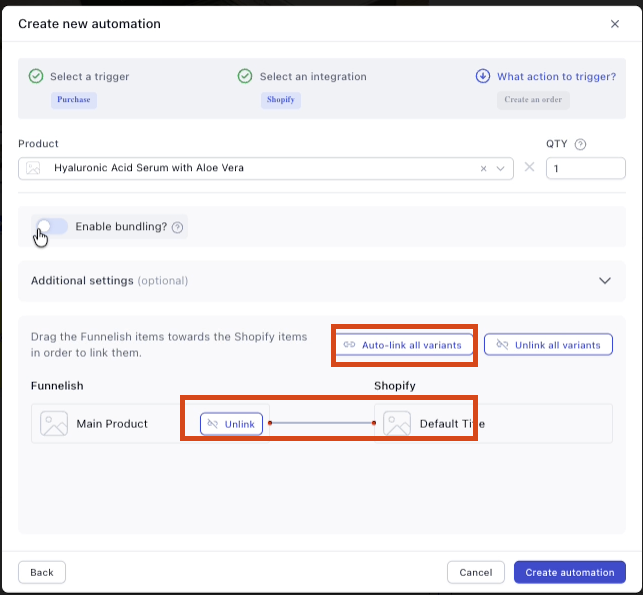 Make sure that the products are linked, you can click ‘auto-link’ or press and hold the product under funnelish and drag it to the other product.