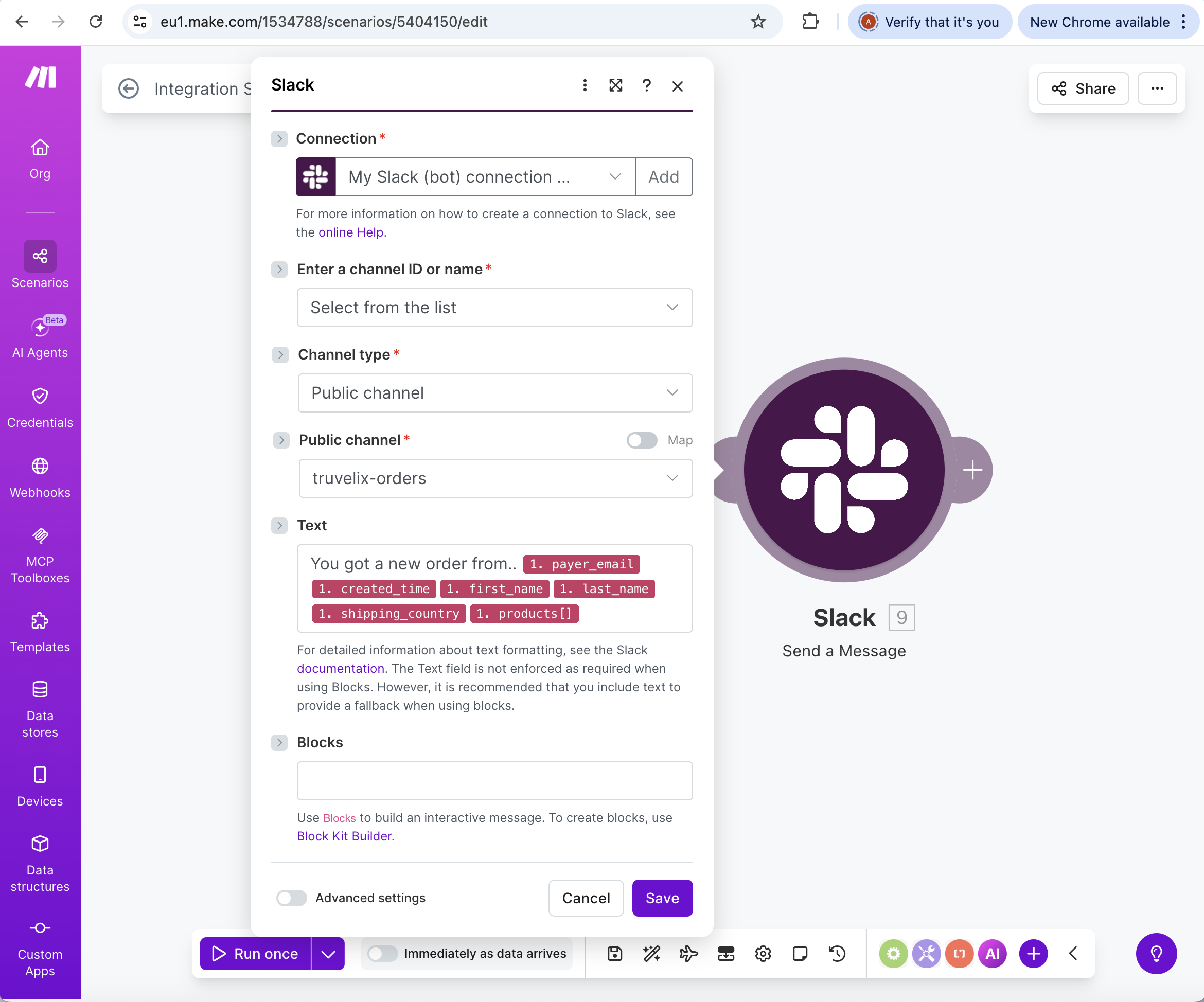 Now we tell Make to forward that data to your Slack channel in a readable format.
