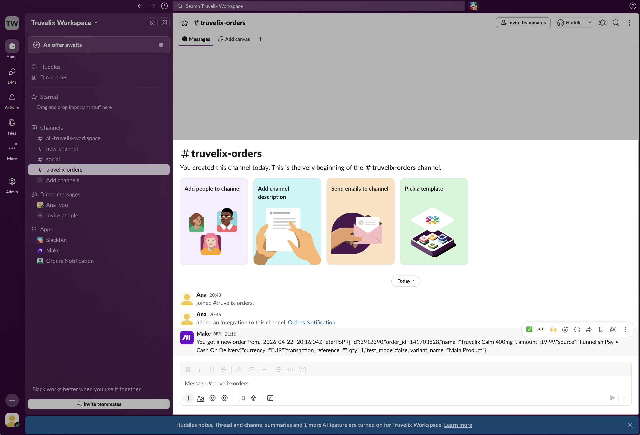 Setting up real-time order notifications is a great way to keep your team motivated and on top of fulfillment. Because Funnelish and Slack speak slightly different data languages, we will use Make.com (a free automation tool) to act as the translator between them.