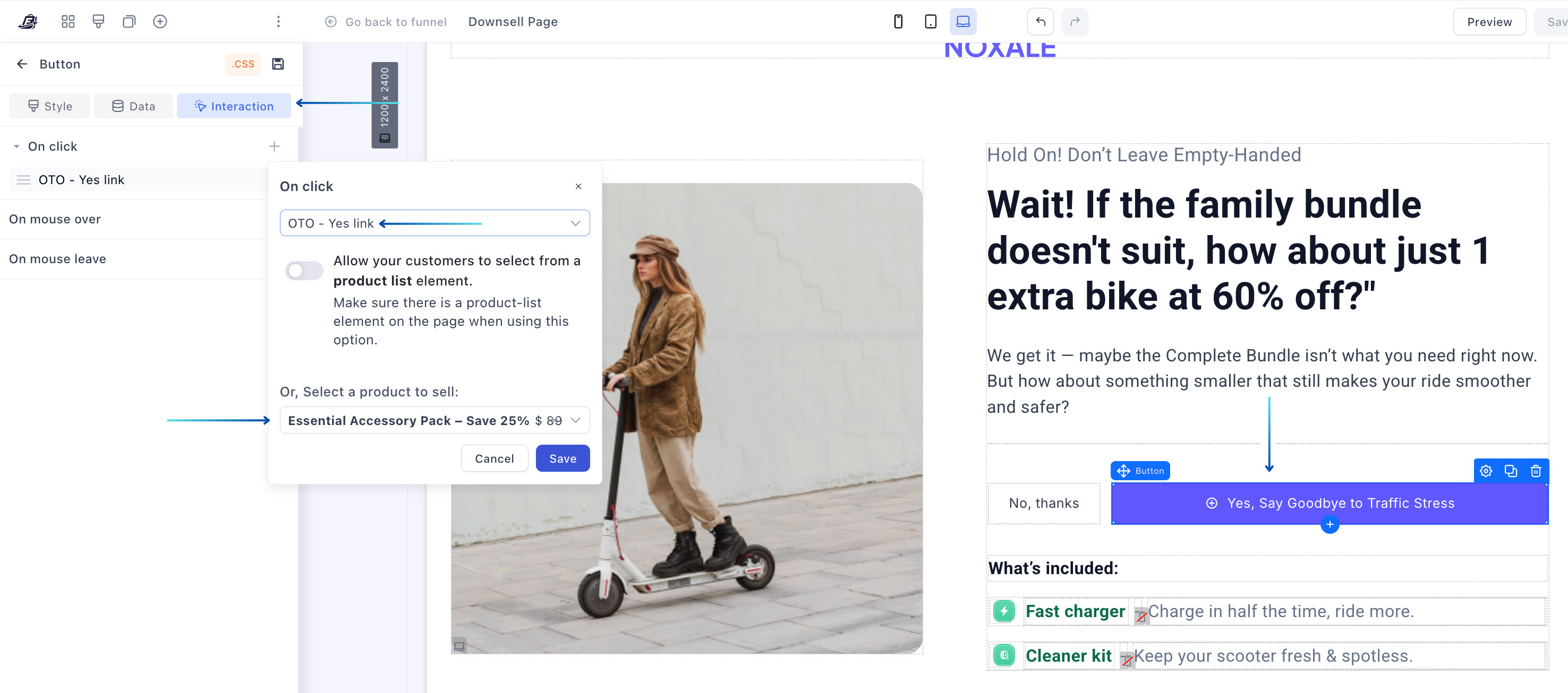 Click on your “Yes” button. Go to the left-hand settings panel, find Interactions, and set the click action to OTO YES Link (or Accept OTO).