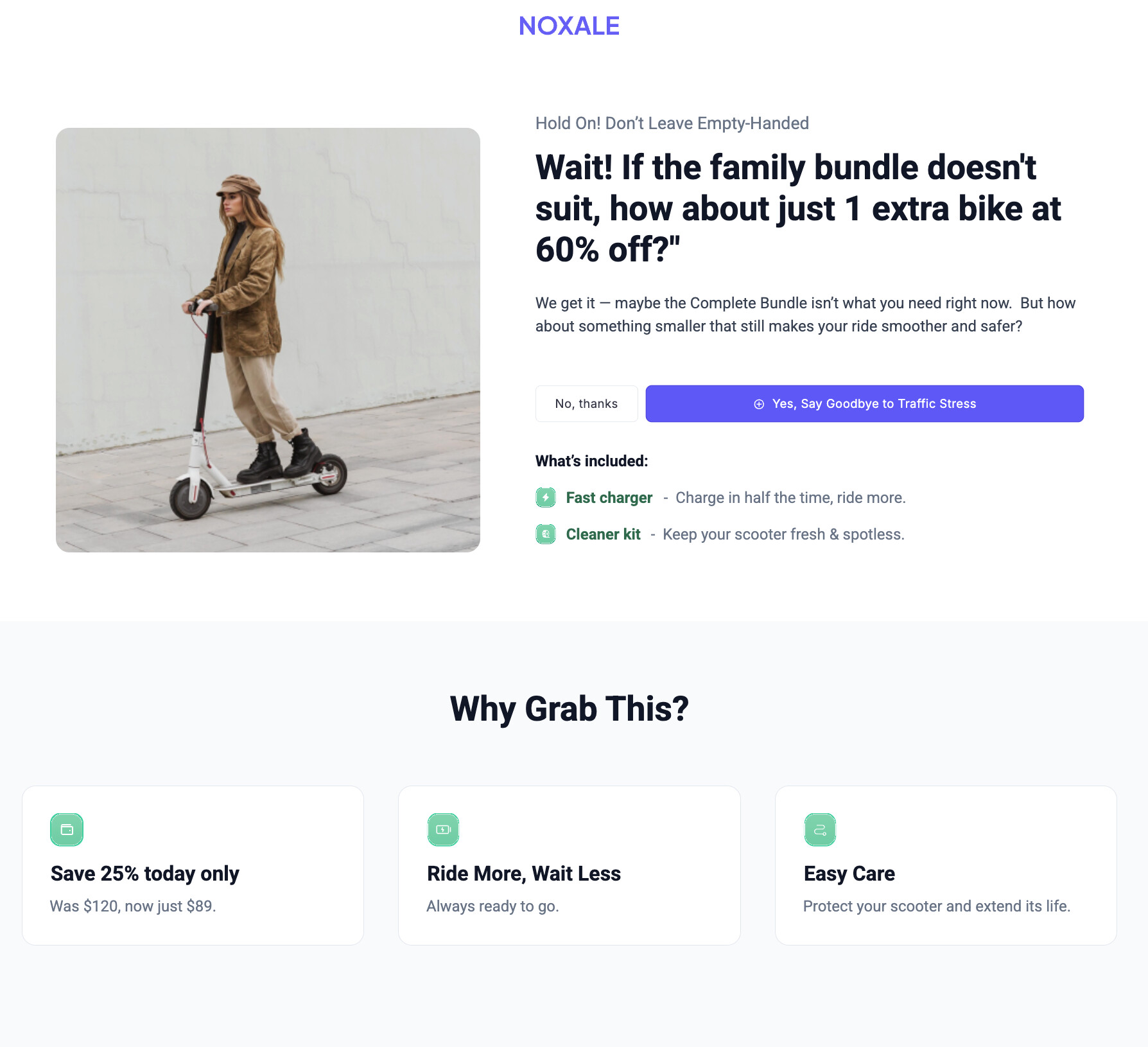 If your upsell was a massive, high-ticket bundle (e.g., 3 extra bottles of supplements for $99), the downsell should lower the barrier to entry. In most cases, the highest-converting downsell is actually the exact same product presented in a more accessible way: