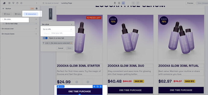 4. Lastly, go back to the landing page and set the action of each button button to go to the URL of the corresponding checkout page for that specific product.