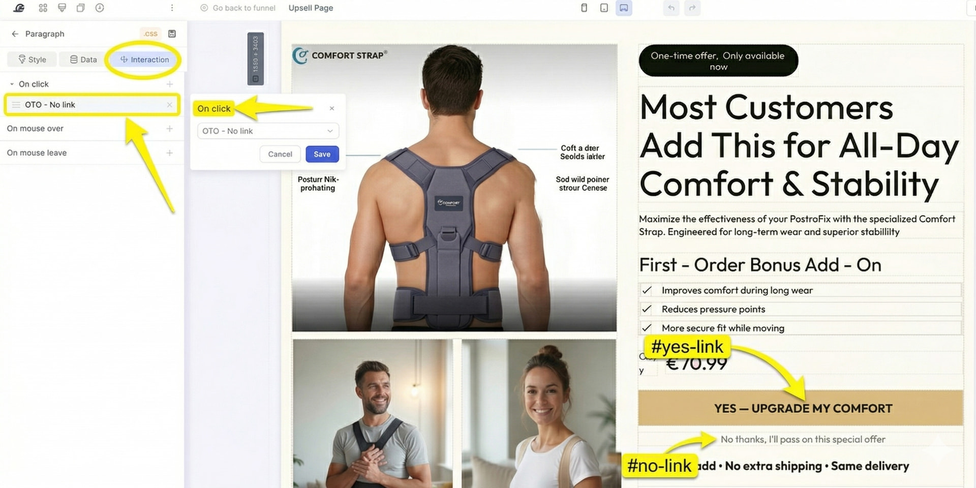 In the left settings panel, set the Button Action to #no-link (Declines the offer/Upsell).