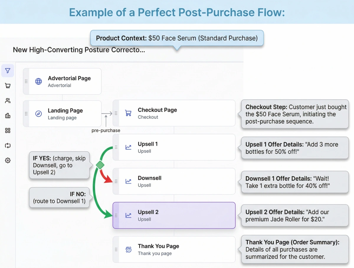- If Yes: Customer is charged, skips Downsell 1, and goes to Upsell 2.
