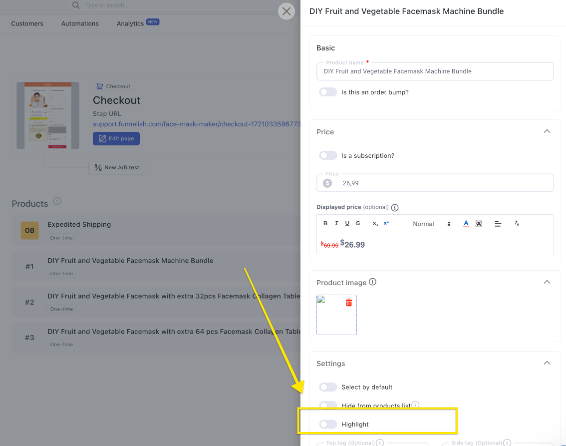 Simply go inside your Funnelish product settings and toggle on the highlighting setting.