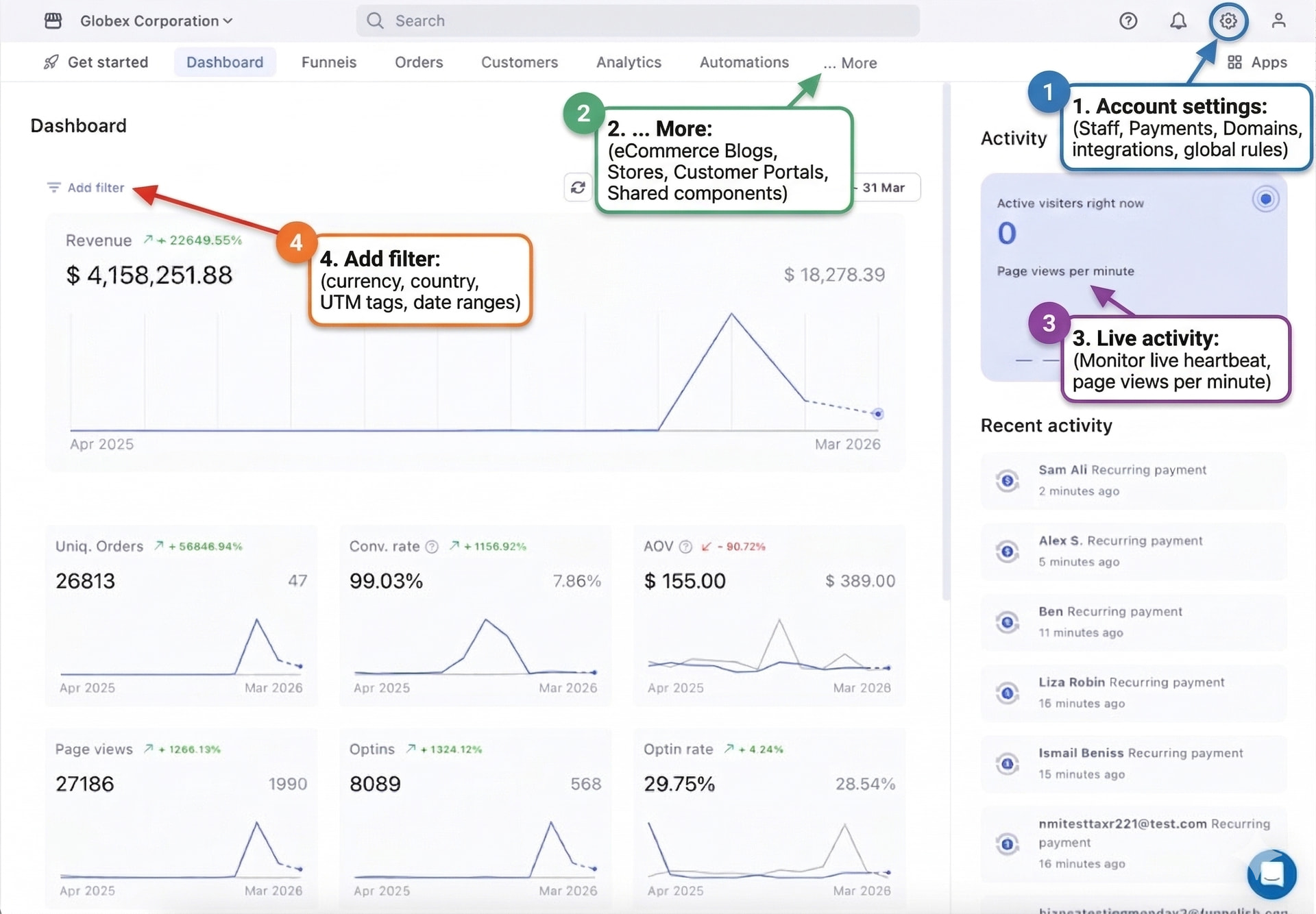 - Dashboard: Your live “heartbeat.” Monitor revenue, conversion rates, active visitors, and real-time page views at a glance.