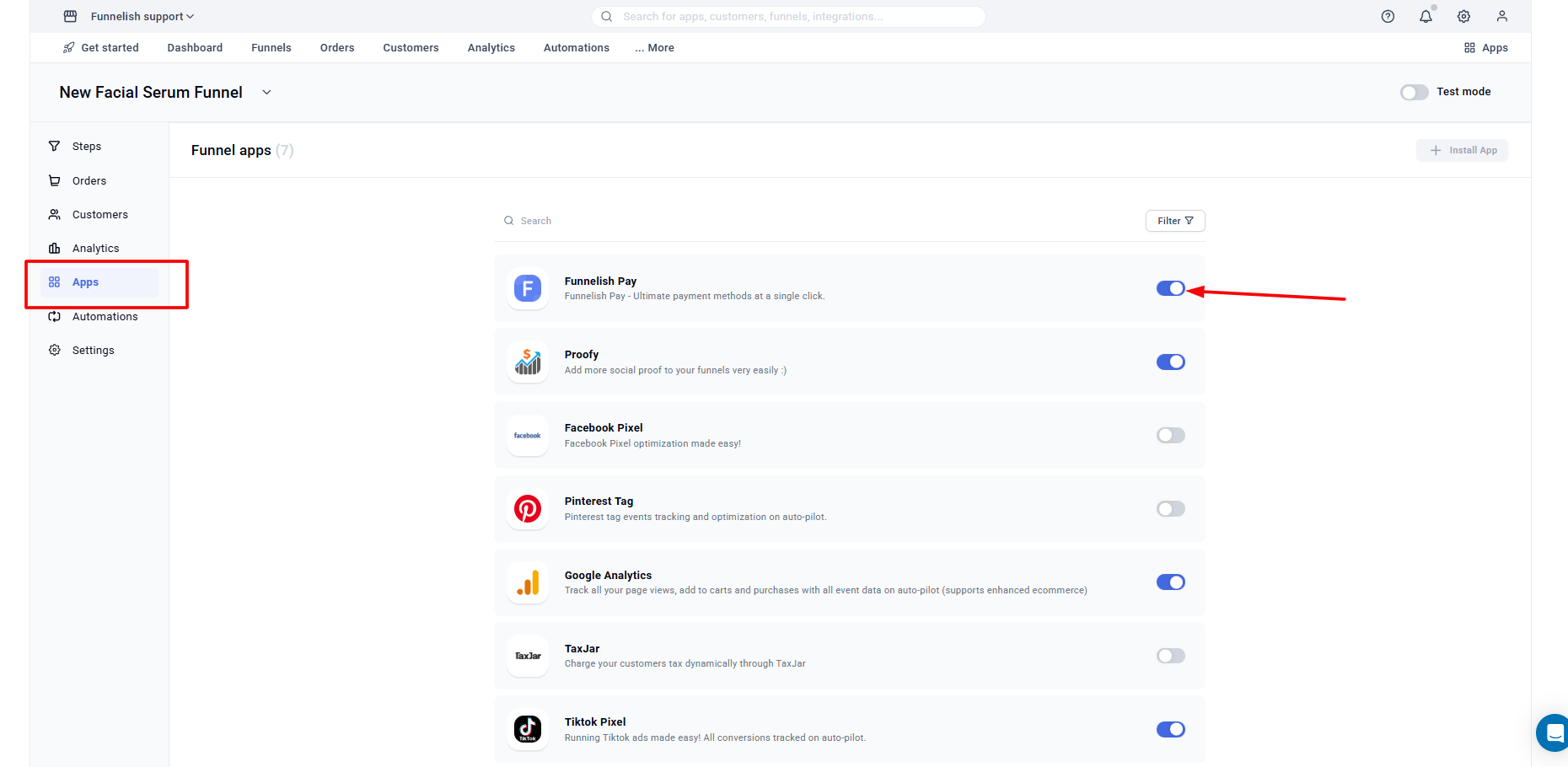 To set up the payment gateway you must first enable FUNNELISH PAY in GLOBAL APPS: