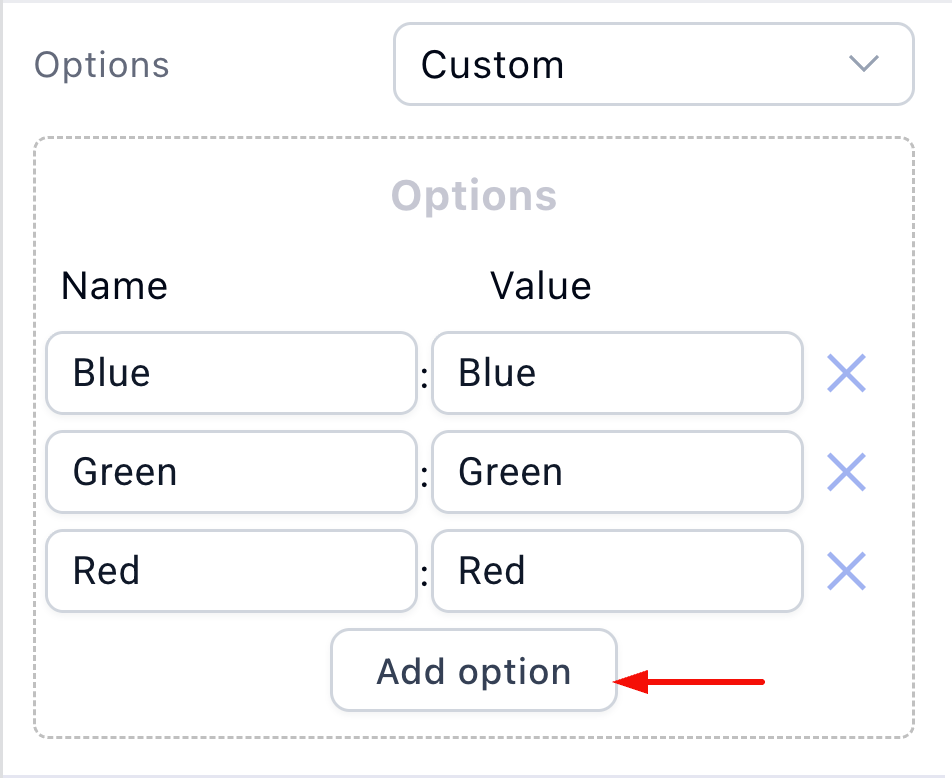 Enter the Name (what the customer sees, e.g., “Blue”) and the Value (what the system records, e.g., “Blue”). Repeat this until all your colors are added.