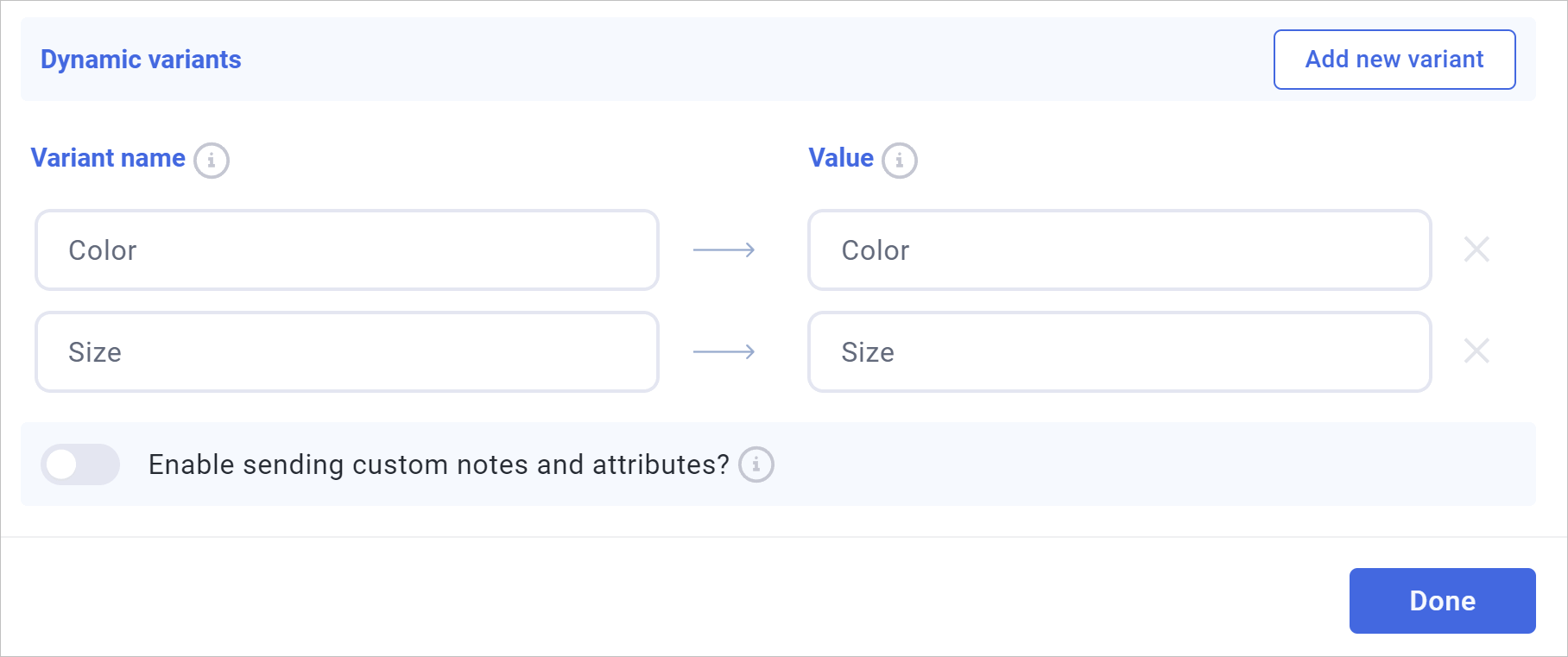 Click Add new variant again and repeat for the next one (Variant Name: