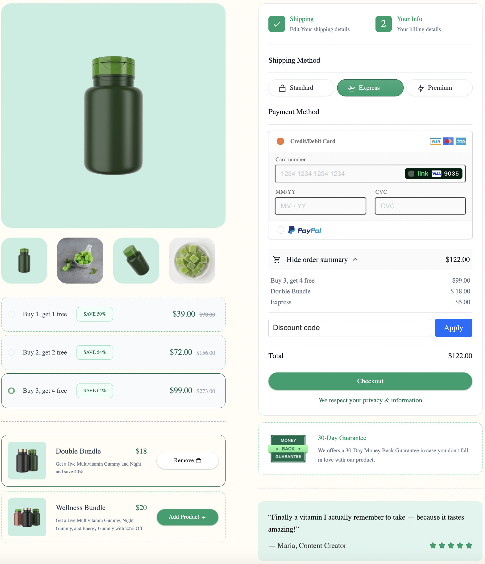 In the example below, notice how order bumps are used to seamlessly introduce complementary products that go hand-in-hand with the main item - along with upgraded shipping options.