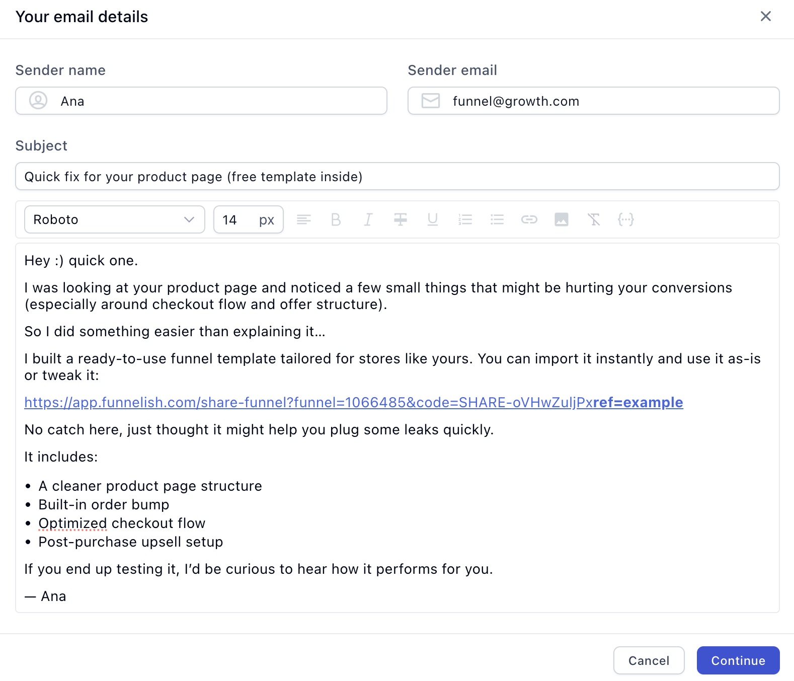 But if you say, "Hey, I noticed your product page is leaking traffic. I actually built a custom, high-converting checkout funnel specifically for your niche. You can have the template for free right here," they will click it instantly.