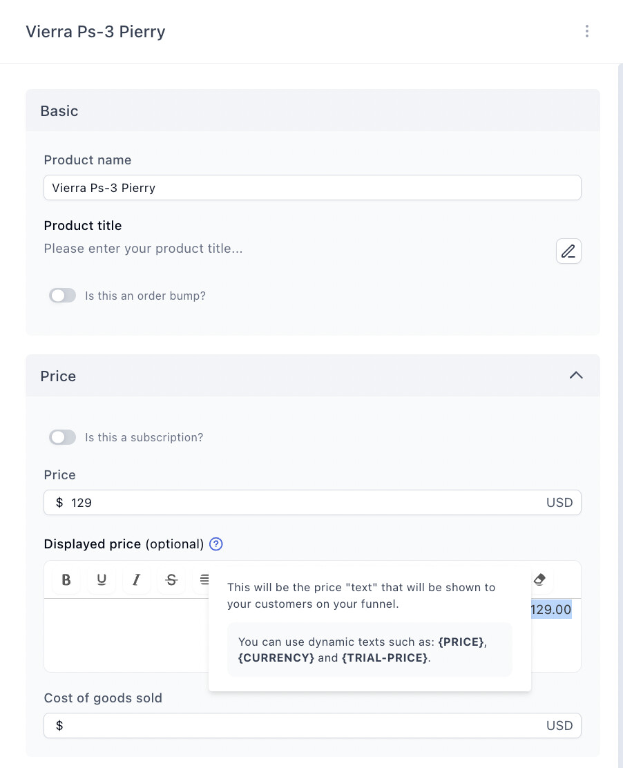 Displayed price customization is super easy on Funnelish funnels and there is no need for any app.