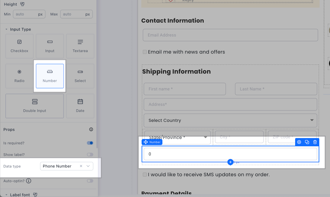 - Make sure the phone number field’s input type is set to Number as shown below